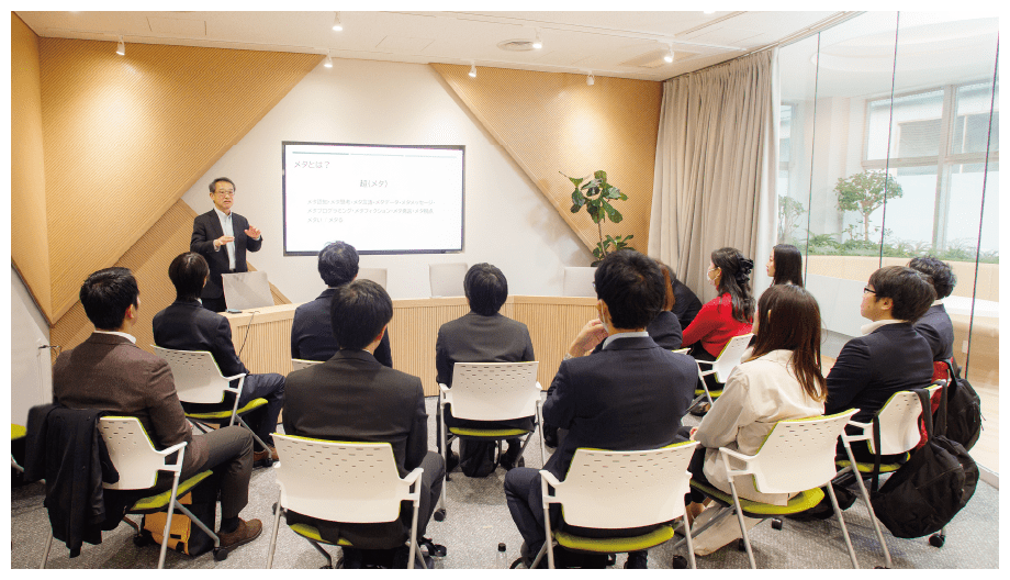 第7回RaaS委員会当日。大塚社長とRaaSの12名はMGCコモンズセミナールームへ集合。大塚社長は開会の挨拶の後、今回のグループワークのテーマである「仕事に臨む際のメタ視点の重要性」について語りました。「例えば、営業をするのにも、価格や品質といった視点だけでなく、業界の状況や競合の事業方針・研究スタンスなど、総合的な視点に立てば、違ったものが見えてくるはず」との話に聴き入る一同。